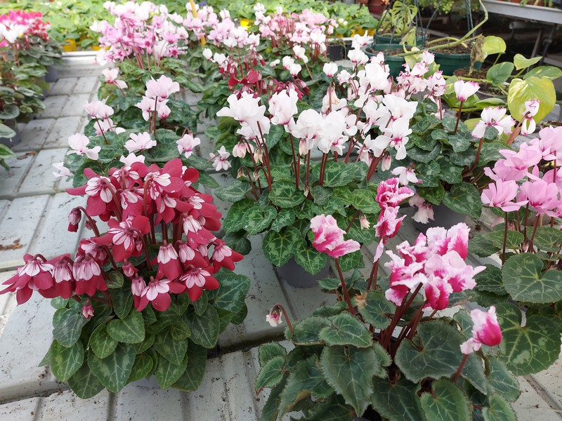 Nous vous proposons pour les rebords de fenêtre et endroits non gélifs les cyclamens: 8 mois de floraison sans souci.